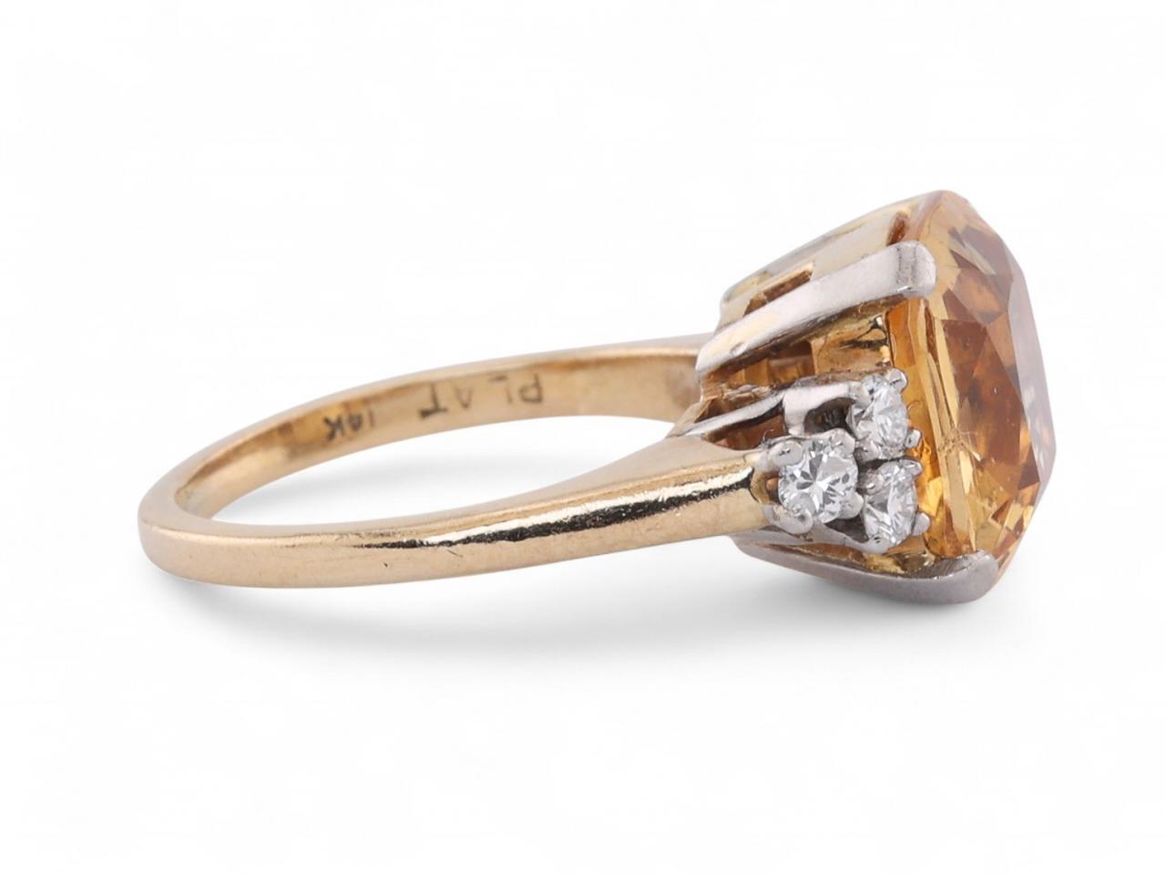 A striking ring set with a cushion-cut yellow topaz weighing approximately 4.93 carats. The stone is accented on each shoulder by brilliant-cut diamonds, adding sparkle to the bold centre. Mounted in platinum and 14ct gold. Finger size I.